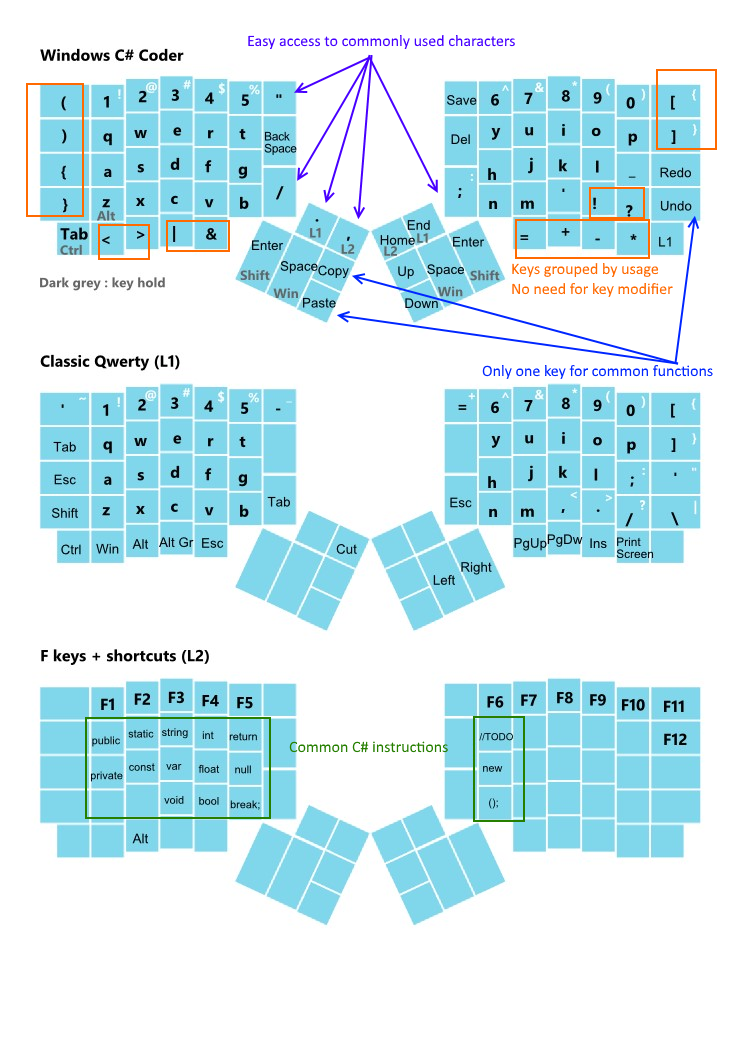 I came to the realization that my main tool as a developer, the qwerty keyboard was something that did not evolved at its core in almost 150 years. There are a lot of reasons to this, and it would be a massive entreprise to change a standard so strongly anchored, but I wanted to give it a try and see how would look an input device dedicated to developers, more specifically a C# developer in my case. The biggest flaw in standard QWERTY keyboards was that I always needed to perform key combination to access commonly used characters or actions. Think about it a minute, how many times a day do you press a modifier key such as Ctrl or Shift, it's insane and could be so easily optimized to require only one key press.